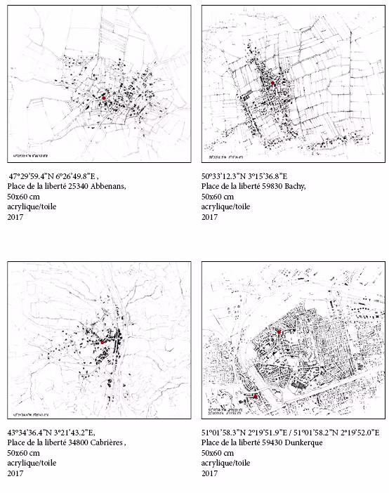 L’odyssée « Le chemin de la Liberté » découle également d’une de des séries de l’artiste « Hétérotopies » qui recense les Places de la Liberté en ordre alphabétique en fonction des noms des villes.
