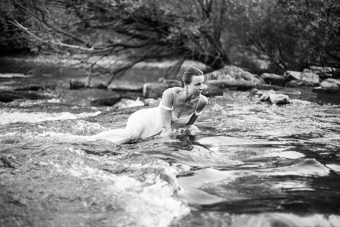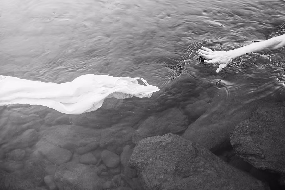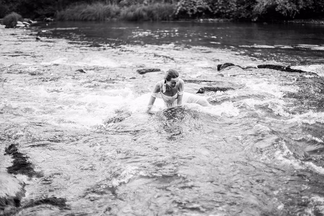 Dans son ouvrage « L’eau et les rêves » Gaston Bachelard parle de plantes rhéophiles qui, ayant un système racinaire profond, résistent et vivent dans les courants d’eau. J’ai souhaité créer une Ophélie rhéophile, la performance consistant à marcher à contre-courant dans les vagues de la rivière, le Tarn en l’occurrence. La rivière transforme les frontières en lieu de métamorphose. Telle une mue abandonnée, la robe imprégnée du passage de l »eau garde le souvenir de la métamorphose.