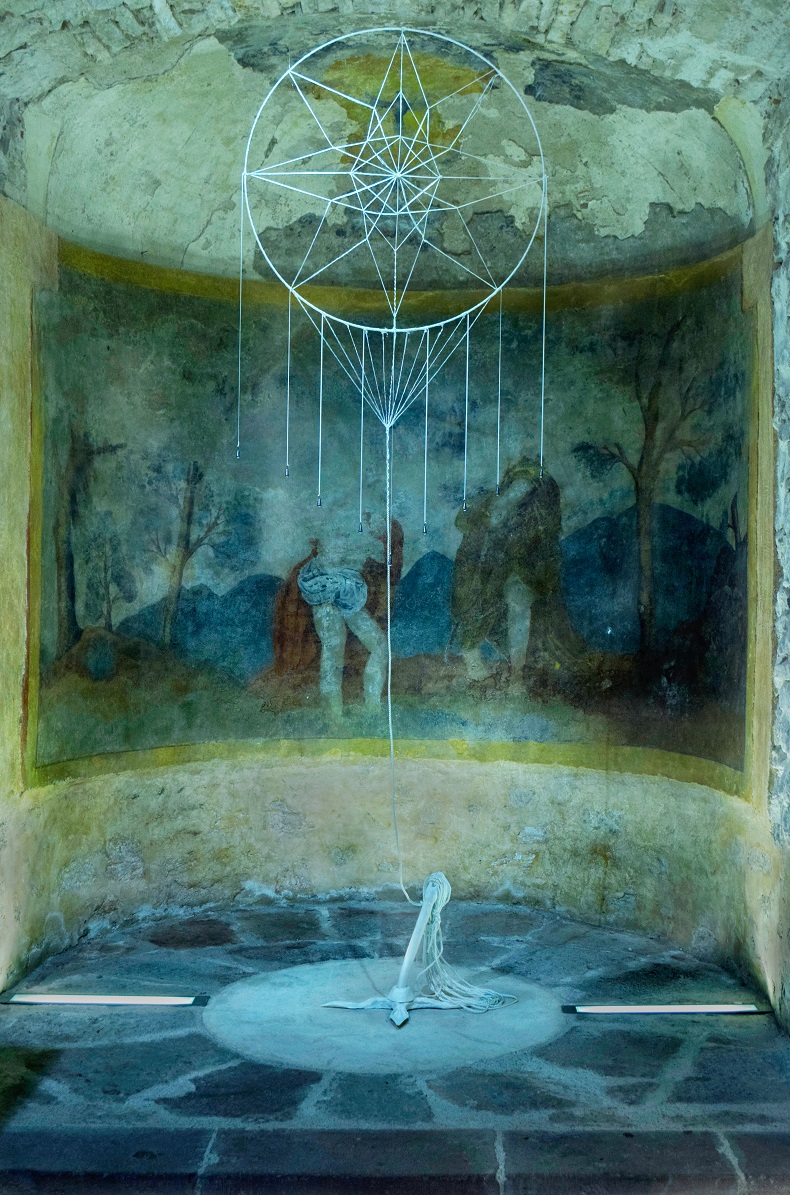 Sculpture en porcelaine et cordage détressé.
