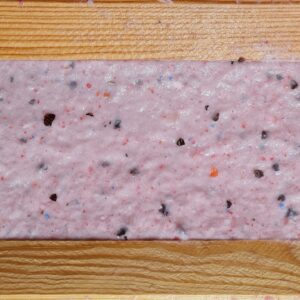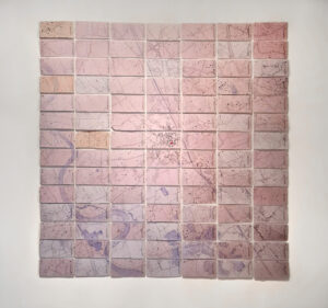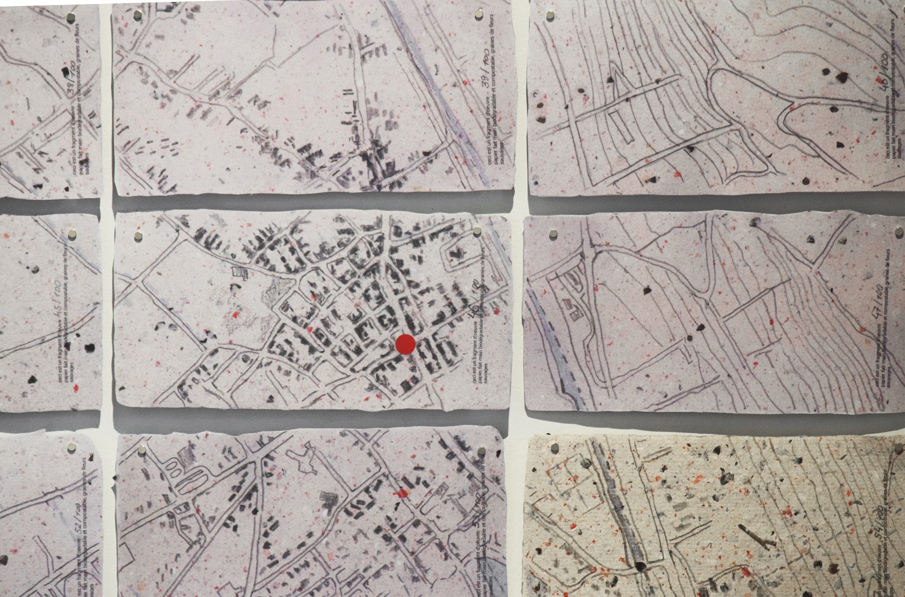 À juste titre, la graine est présente dans l’exposition sous les trois différents stades de son développement. Au départ, il y a la graine sous sa forme première, celle qui enveloppe la vie future. C’est une oeuvre fragmentée dont le papier a été fabriqué à partir de brochures qui allaient finir à la poubelle. Ce papier, soigneusement produit, renferme des graines de fleurs sauvages. Chaque papier créé devient, à la fois une invitation à l’exposition, et un fragment de dessin représentant la carte de Grisolles. Chaque personne possédant l’une de ces invitations, possède en réalité un fragment d’oeuvre biodégradable et compostable. La totalité de 98 fragments a été scannée, ce qui permet de reconstituer l’image finale dans l’espace d’exposition. Les invités pouvaient prêter au musée, pendant un certain temps, leurs fragments afin de voir l’œuvre dans sa version originale.
