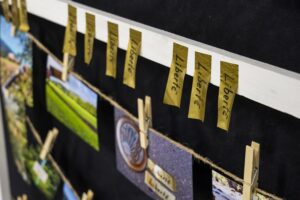 Vue de l'exposition "Au plus près de ma nature…" à Caza d'Oro, Le Mas d'Azil Dimensions variables Impression de photos, cadres, fil de jute, pinces à linge, textes