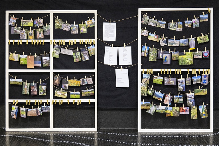 Vue de l'exposition "Au plus près de ma nature…" à Caza d'Oro, Le Mas d'Azil Dimensions variables Impression de photos, cadres, fil de jute, pinces à linge, textes