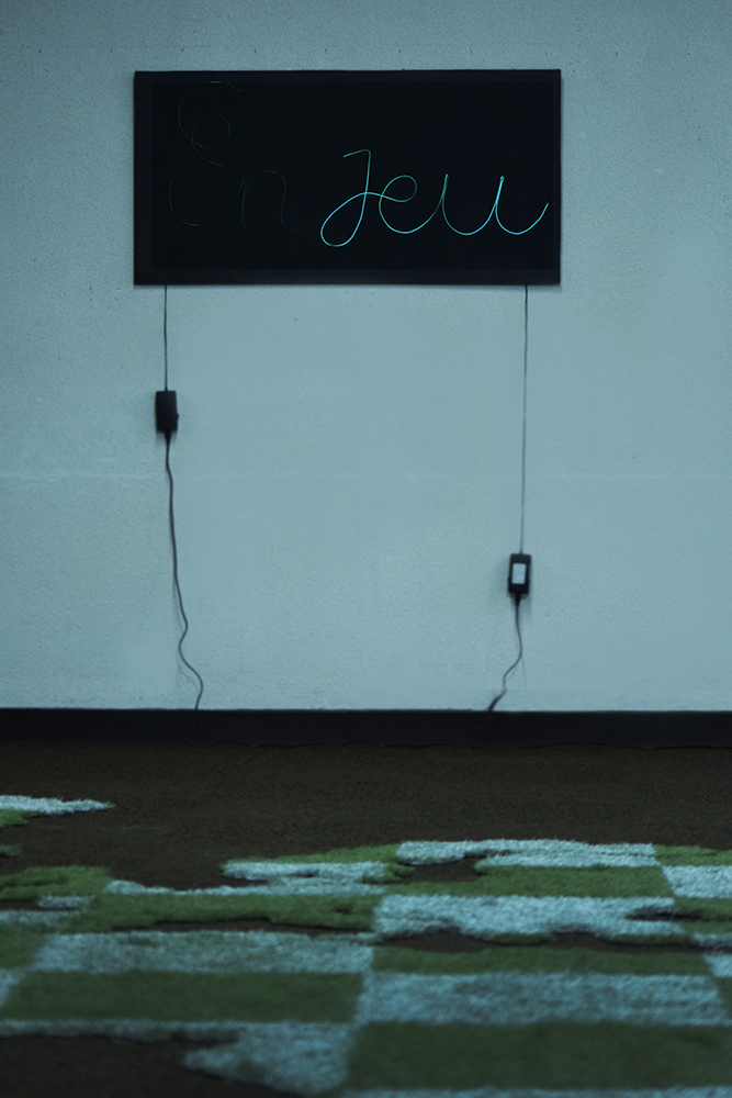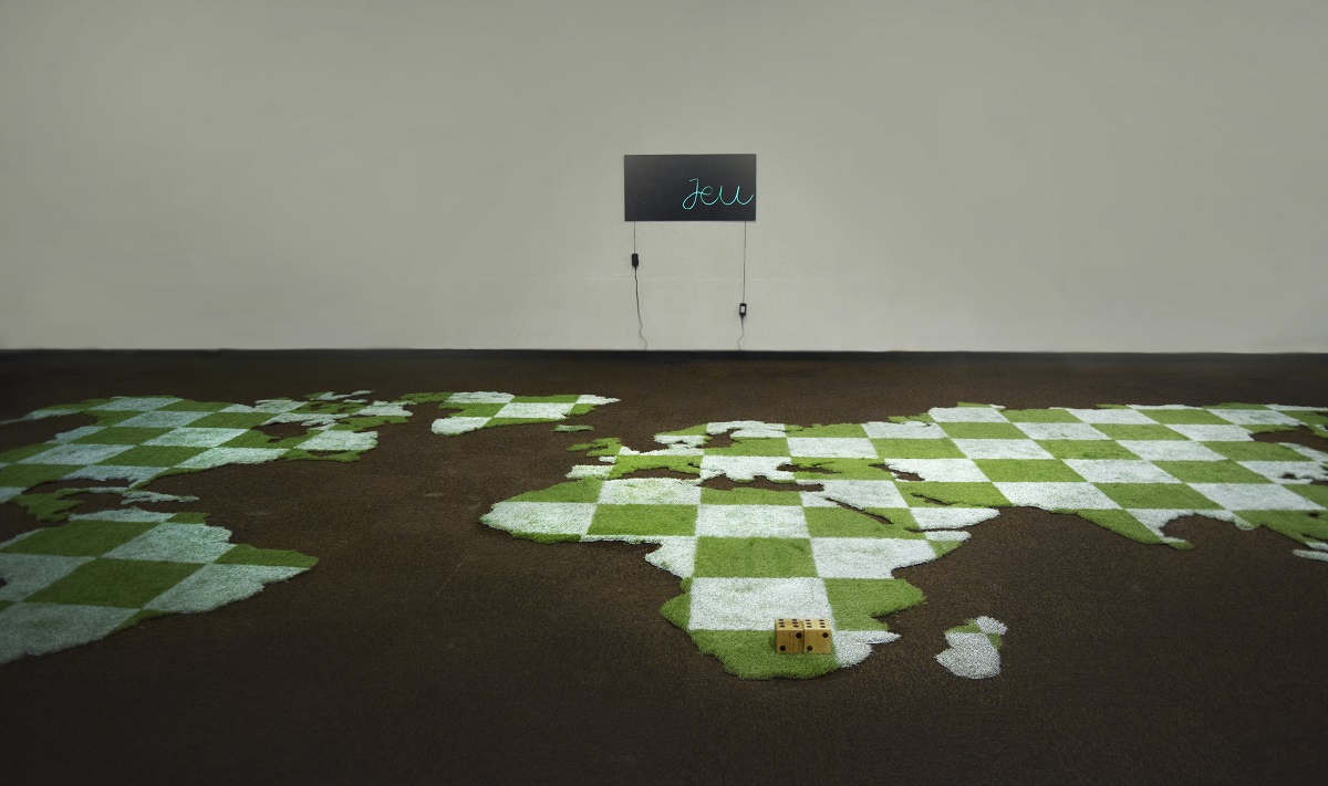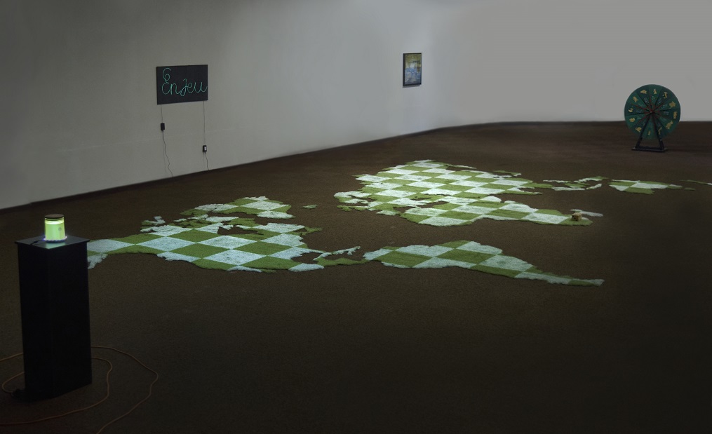 La cartographie, les territoires et le déplacement sont depuis longtemps le centre de mes préoccupations artistiques. Ainsi, pour l’exposition l’En’Vert du décor j’ai souhaité créer un damier géant en gazon synthétique. Un terrain de jeu qui prend la forme de la carte du monde.
