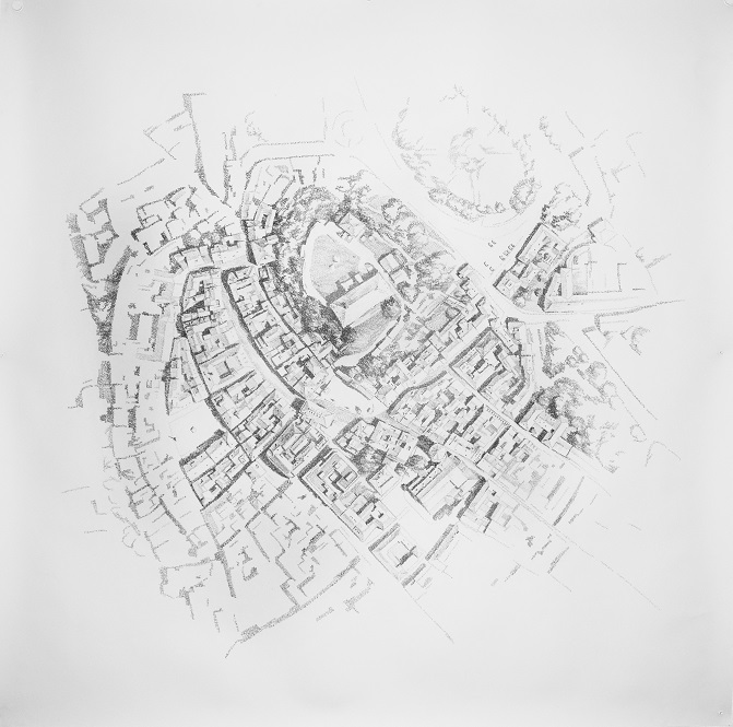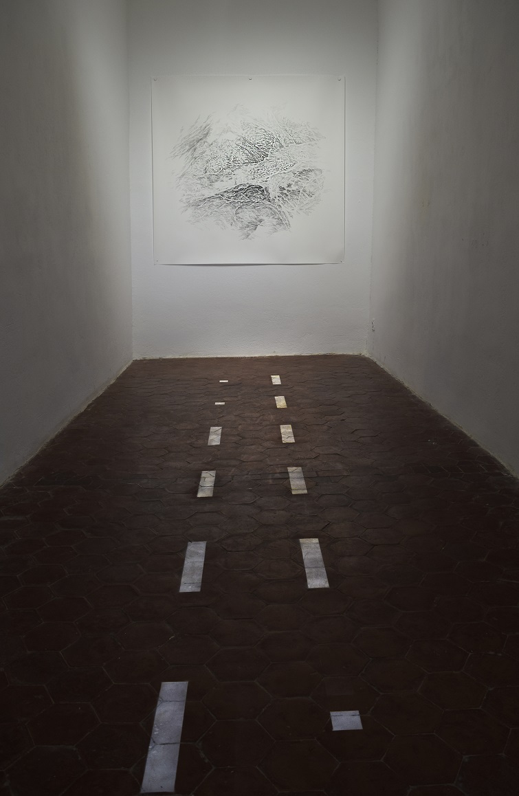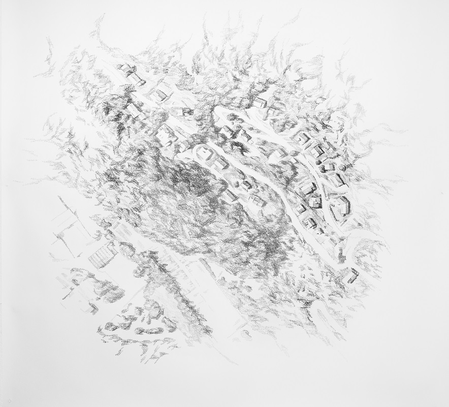 Le mémoire des territoires se mélange ici avec ma propre mémoire créant des dessins constitués uniquement de ce mot générique « mémoire » qui se superpose en plusieurs couches. Les dessins, tels des stratifications de mots, révèlent les lieux.