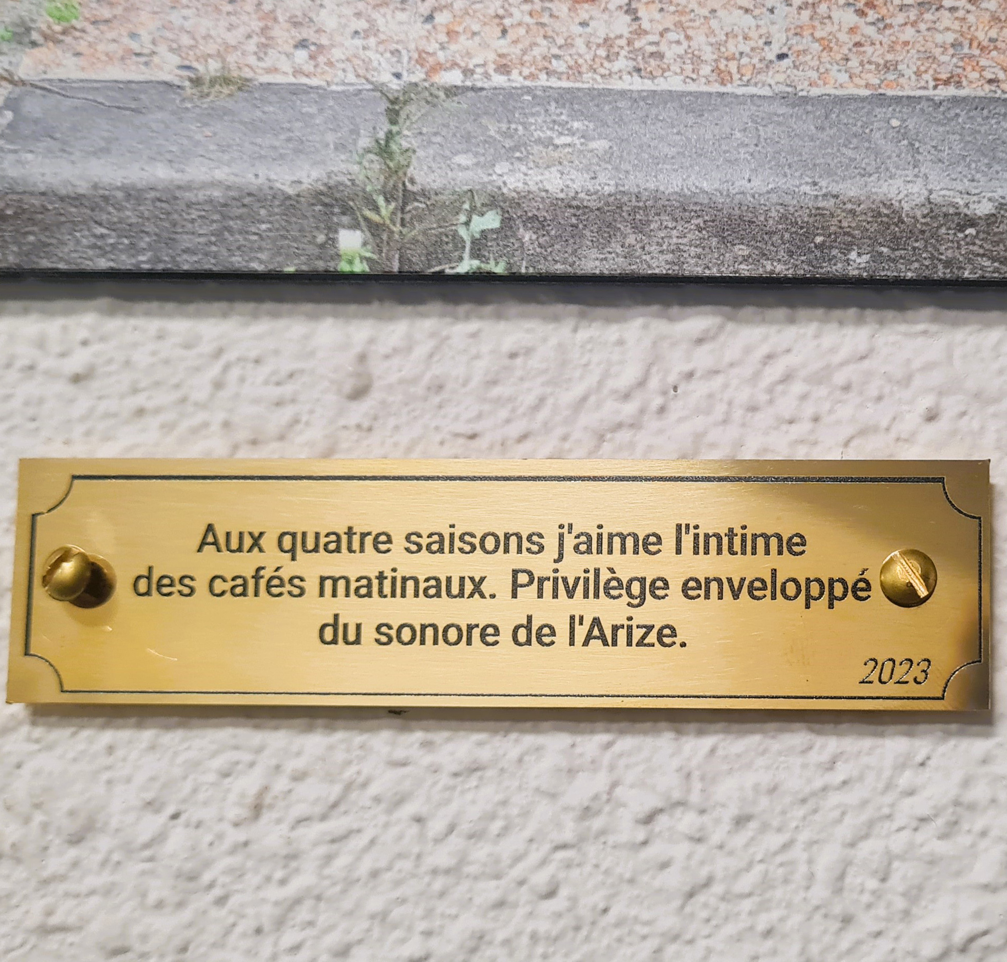 Vue de l'exposition "Au plus près de ma nature…" à Caza d'Oro, Le Mas d'Azil Impression de 27 photos sur dibond 30×30 cm, 20 plaques en laiton gravé 10 x 2,5 cm