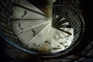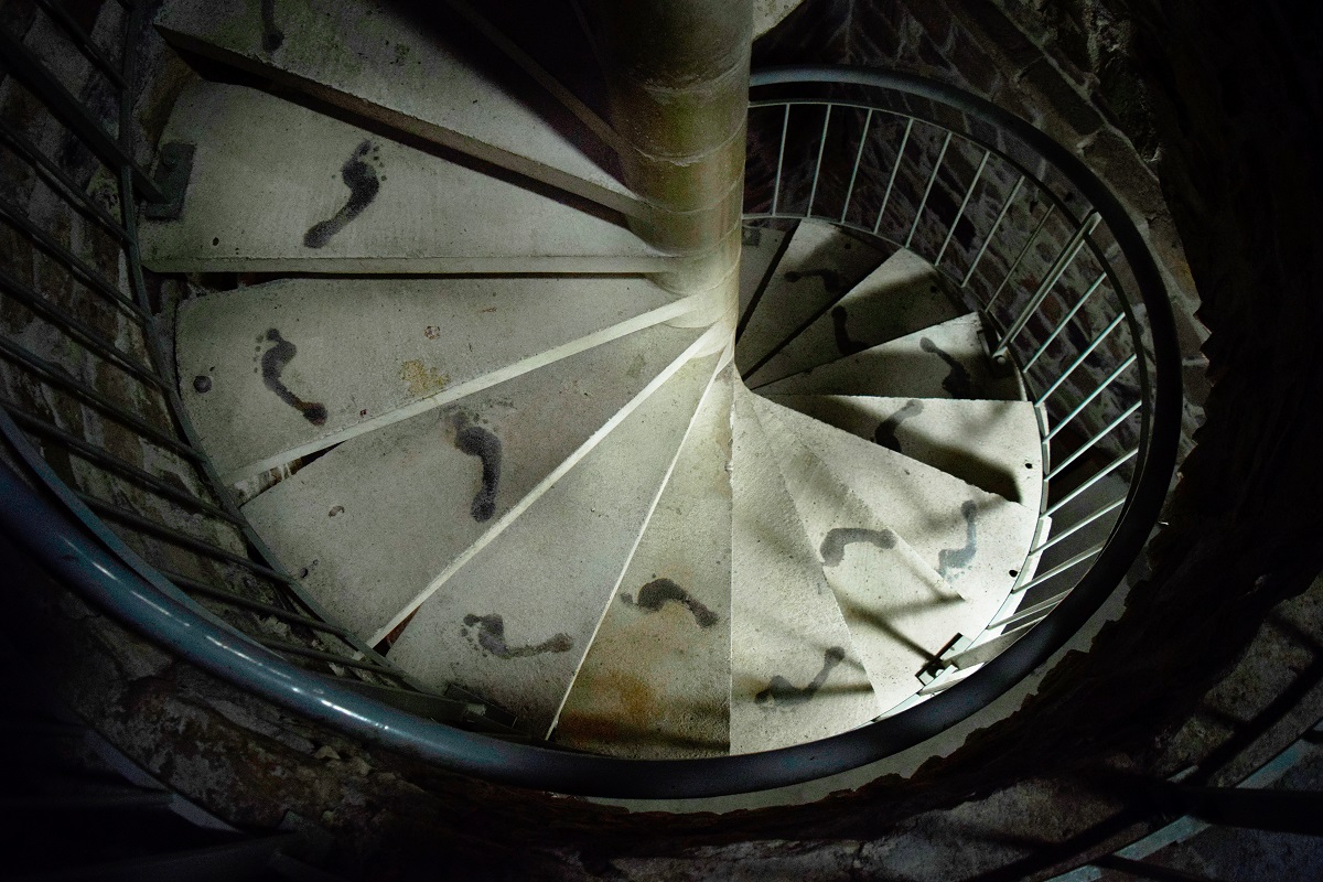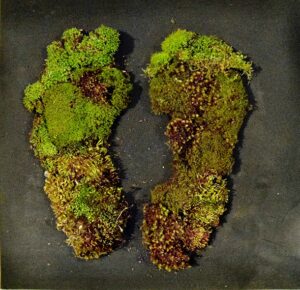 Lors de mon cheminement performatif "Back on track" pour retrouver mes racines premières, le sentier poussiéreux sur lequel les traces de mes pas se mêlaient à d’autres pas, a fait émerger dans ma mémoire un poème appris il y a 15 ans en Moldavie. ‘‘ Il n’y a que la poussière qui restera derrière toi, // Le rien t’a amené dans le monde, le rien t’emportera, // Et rien de tout ce que tu as pu accumuler n’en restera…’’ (Traduction de quelques vers de Şi pulbere, ţărînă… de Veronica Micle) La résurgence de ces vers ont renvoyé ma pensée vers les empreintes de pas d’hominidés bipèdes retrouvées sur le site de Laetoli en Tanzanie. Les traces du passage se sont conservées dans le dépôt d’une couche de cendres provenant de l’éruption du volcan Sadiman il y a 3,7 millions d’années. J’ai souhaité investir l’escalier en colimaçon du musée de Saint-Raphaël avec des empreintes de pas. Ces empreintes de pas fiés dans de la cendre montent les marches en s’estompant. Deux autres empreintes restent statiques au pied de l’escalier. Le temps les a recouvert de mousse, la nature a repris son droit.