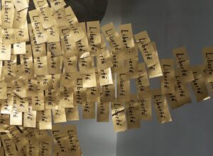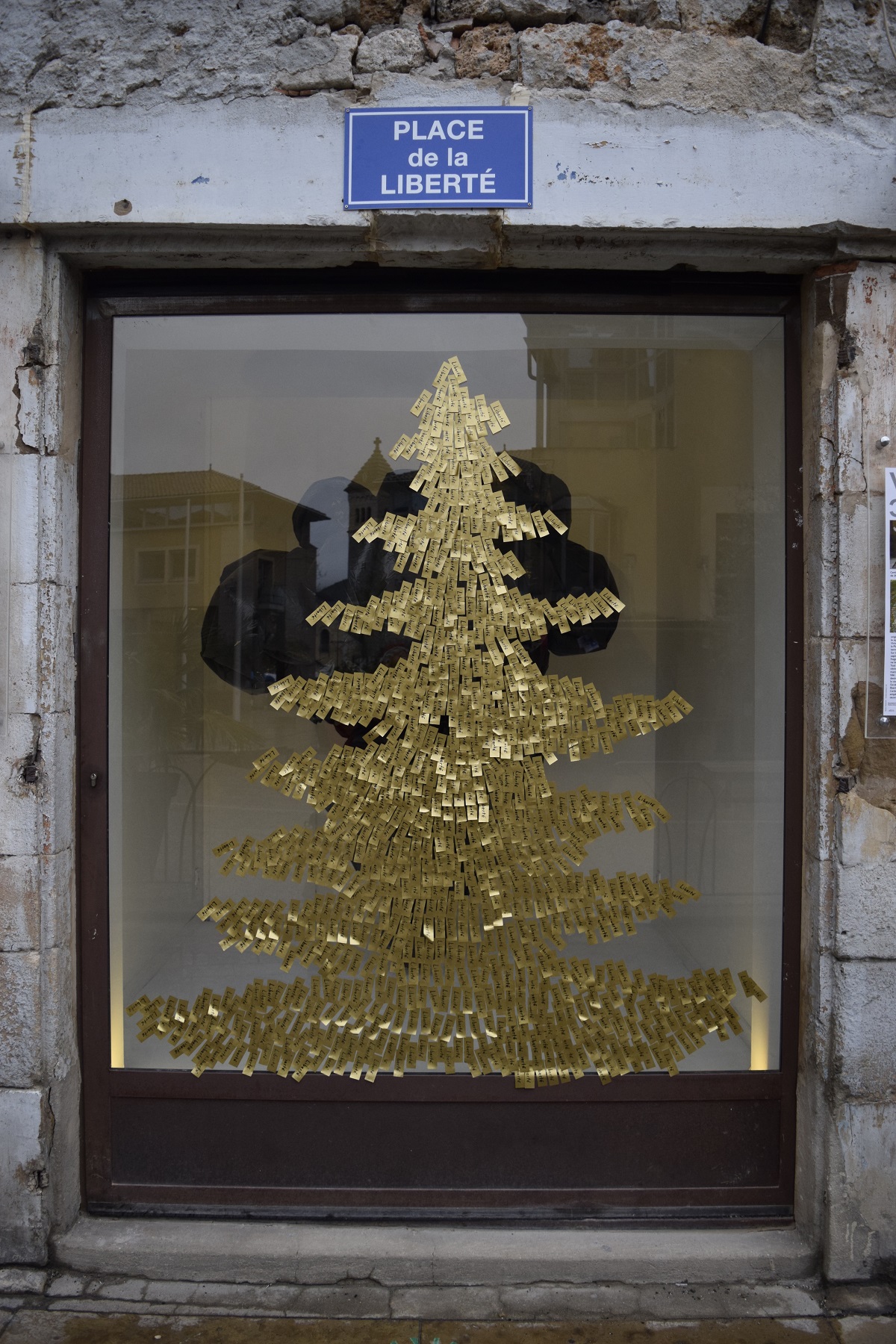Sur la vitrine, l’œuvre éphémère prend la forme d’un sapin constitué de petits mots sur lesquels est écrit le mot liberté. Chacun pouvait emporter avec soi un fragment jusqu’à ce qu’il n’en reste plus rien.