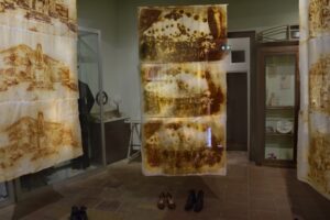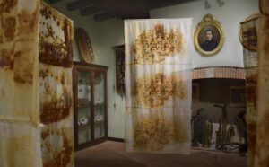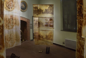 Vue de l'exposition "Aussi longtemps qu'il y aura de la lumière…" Musée Calbet, Grisolles Dimensions variables Gravure de rouille sur tissus, fils, chaussures d'époque