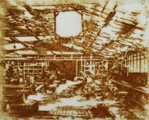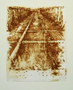 Le « ça a été » fait référence pour moi à l’image que j’ai enregistré à un instant donné, image que je m’approprie par le biais de la gravure. Les plaques en métal sur lesquelles je viens graver font, par l’oxydation de la matière, surgir des images plus ou moins précises. La matrice peut être très détaillée mais ce qui apparaît au fur et à mesure des jours est en partie aléatoire. Telle une mémoire latente l’image apparaît avec des défauts, des manques.