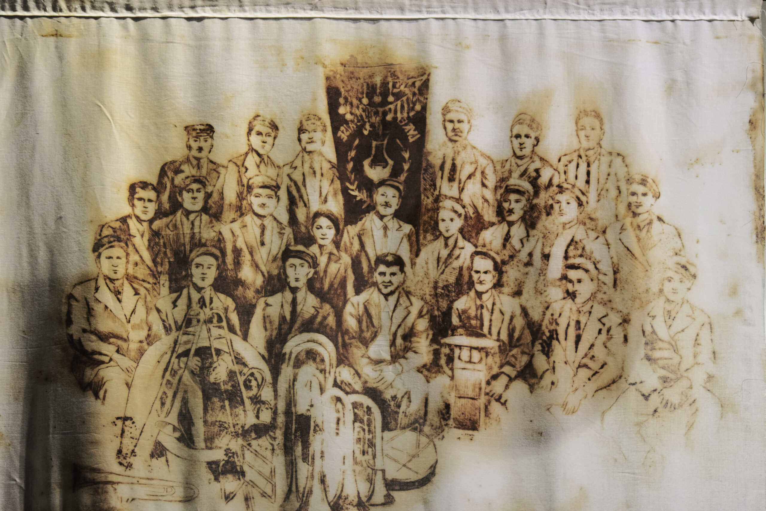 L’eau est l’élément qui entraîne la métamorphose de la matière, une matière dont seraient constitués nos souvenirs et qui laisse surgir les traces du passé. Par moment, la trace n’apparaît pas, mais elle ne disparaît pas pour autant, elle reste endormie, inaccessible. Les souvenirs persistent mais ne surgissent pas. Ils restent présents mais indisponibles. Les gravures de l’installation renvoient aux récits assemblés dans la bande sonore. À travers ces images, on est invités à assister à une scène de bal à Bessens ou à un défilé de la Lyre Grisollaise. Plus loin, une photo de groupe de la Lyre Grisollaise, une image des halles d’un temps où la voiture n’envahissait pas encore les villes et une autre du monument aux morts.