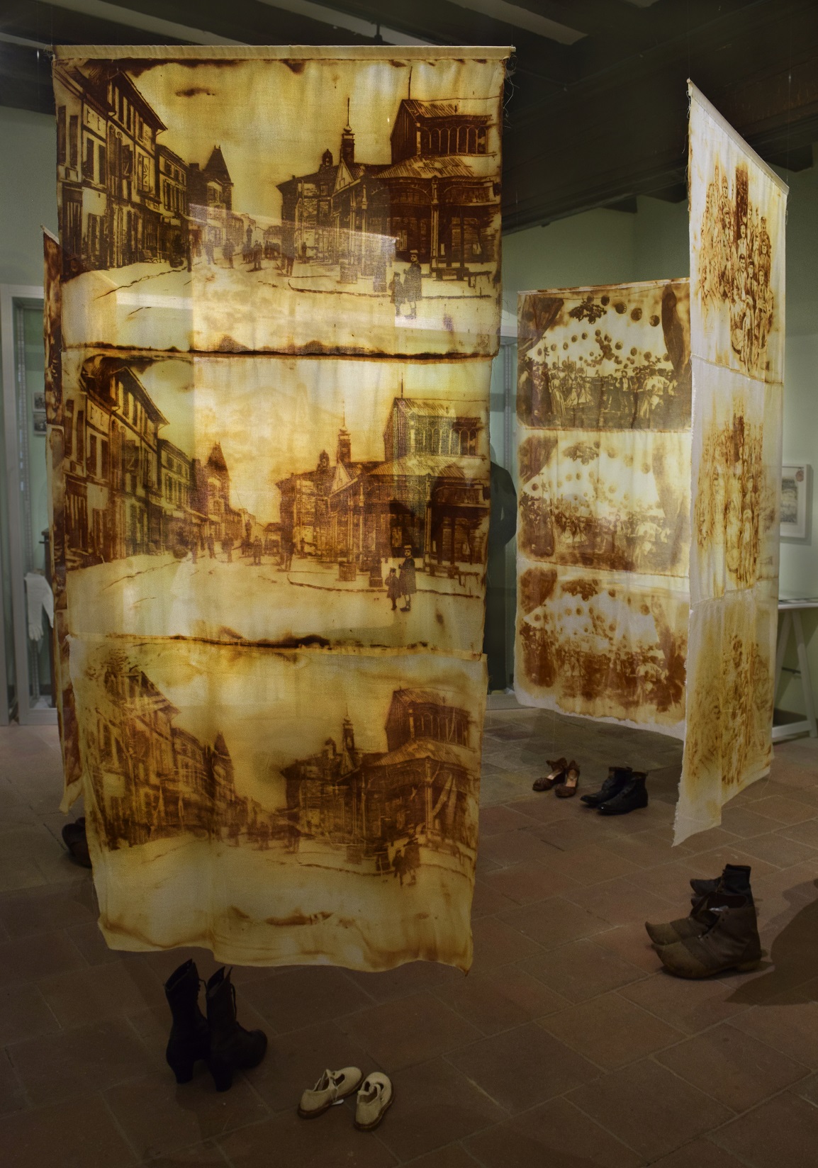 Vue de l'exposition "Aussi longtemps qu'il y aura de la lumière…" Musée Calbet, Grisolles Dimensions variables Gravure de rouille sur tissus, fils, chaussures d'époque